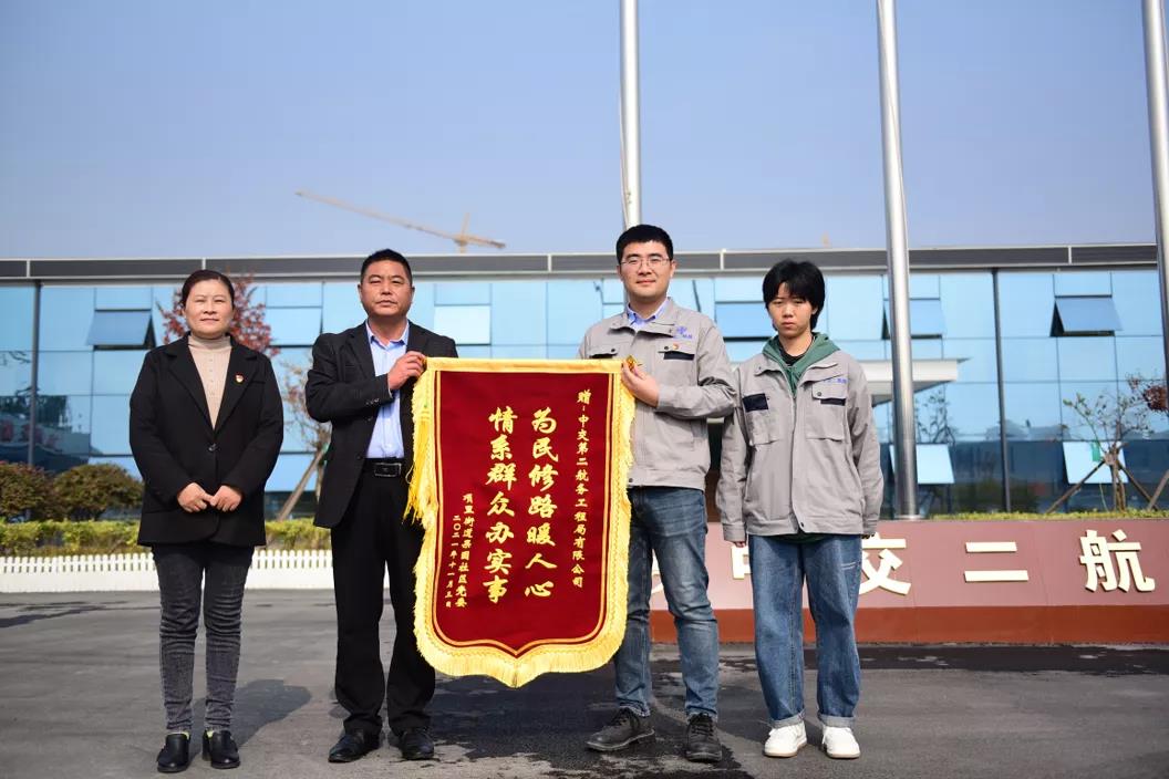 沒(méi)過(guò)幾天,宿城區(qū)項(xiàng)里街道果園社區(qū)工作人員將一面錦旗送到北京路快速化改造工程中交二航局項(xiàng)目部,感謝該項(xiàng)目部幫助解決群眾出行難題。