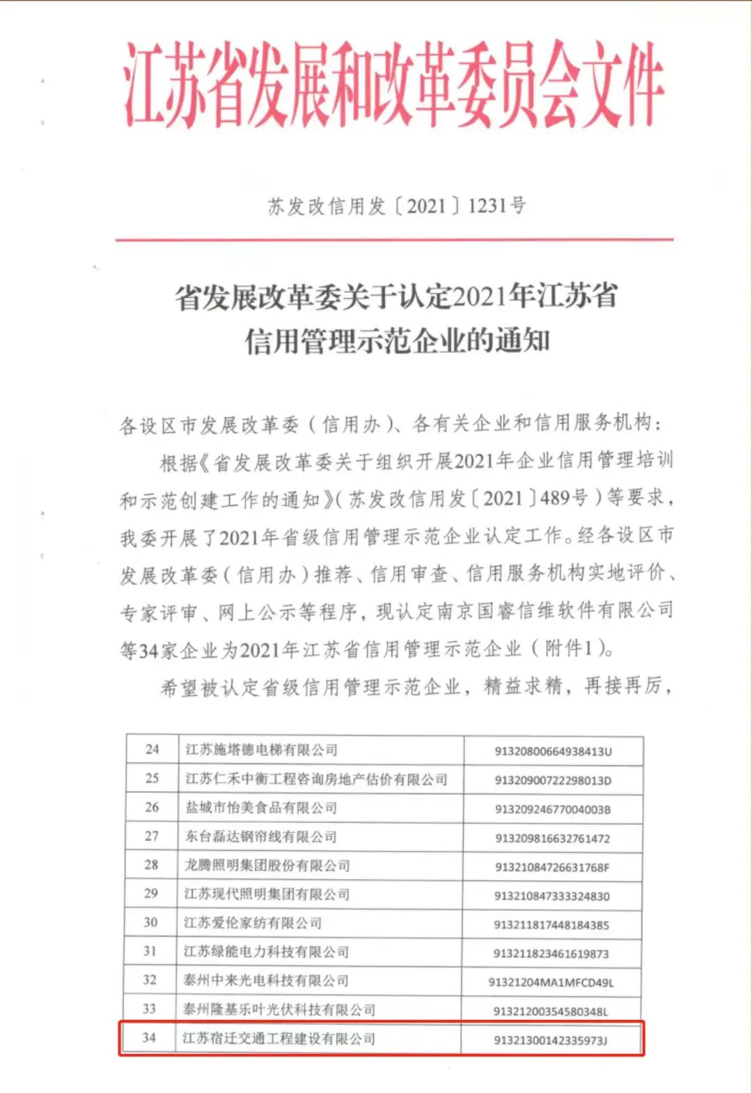近日,江蘇省發(fā)展改革委公布了“2021年江蘇省信用管理示范企業(yè)名單”,其中,宿遷交建成功入選,同時(shí)也是宿遷地區(qū)唯一一家入選的企業(yè)。