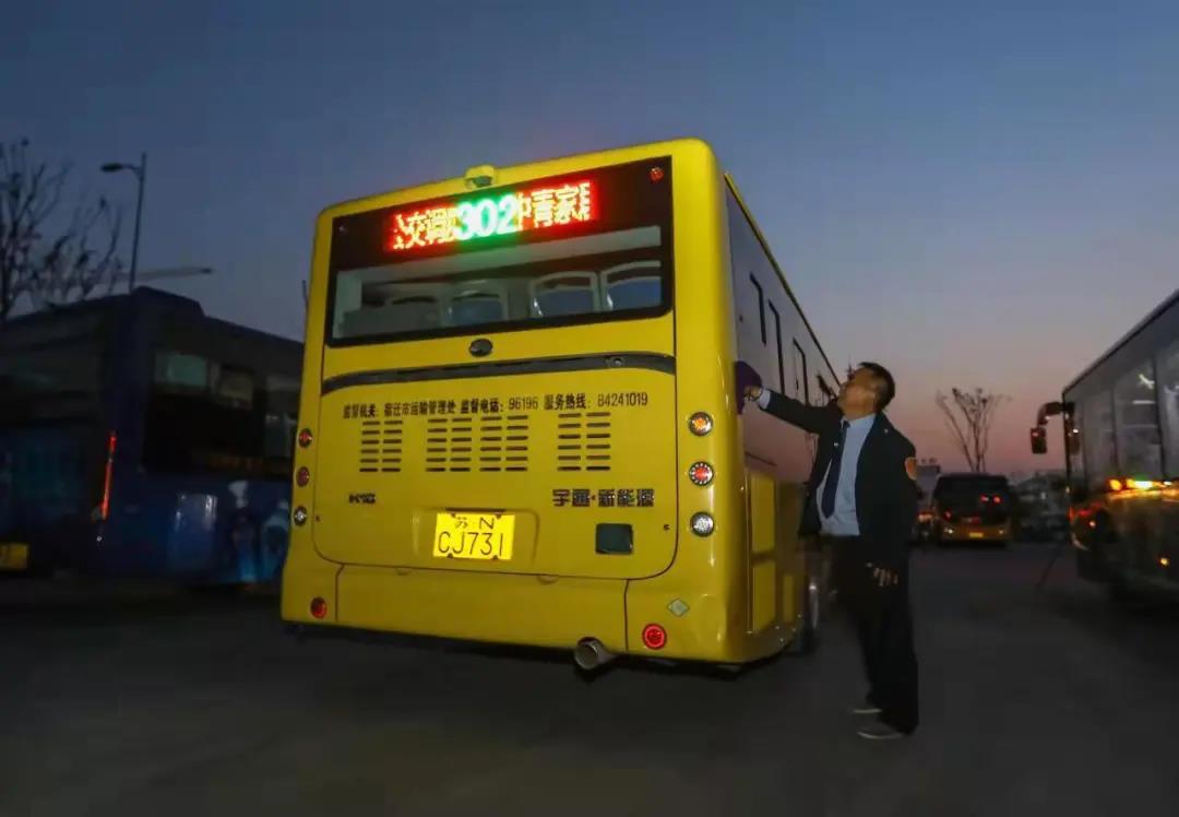 5點半,302路公交車的車牌燈準時亮起,一個身影進出車廂,熟練地逐項檢查電池電量、四輪胎壓、雨刮器等,測試剎車、離合、制動器,確保車輛性能一切正常后拿起抹布和拖把,麻利地將車輛內外打掃干凈。