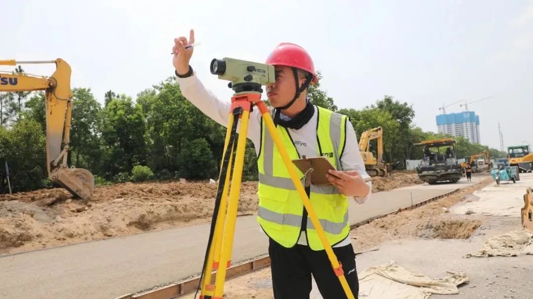 在迎賓大道二期快速化改造工程施工現(xiàn)場(chǎng),機(jī)械轟鳴,施工人員在高溫下?lián)]灑汗水,緊鑼密鼓地進(jìn)行水穩(wěn)攤鋪。施工場(chǎng)地沒(méi)有一絲陰涼,豆大的汗珠順著曬紅的臉頰淌了下來(lái),但技術(shù)人員依然巋然不動(dòng),他深知測(cè)量工作差之毫厘,謬以千里。