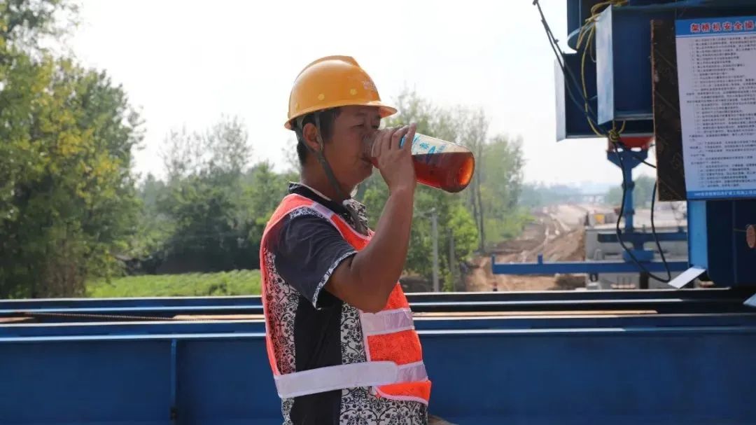在268省道宿遷段工程(洋河新區(qū)段)和346省道宿豫段改擴(kuò)建工程施工現(xiàn)場(chǎng),建設(shè)者們熱情高漲地進(jìn)行橋梁架設(shè),一名工人休息時(shí)刻喝著公司準(zhǔn)備給他們的綠豆茶。