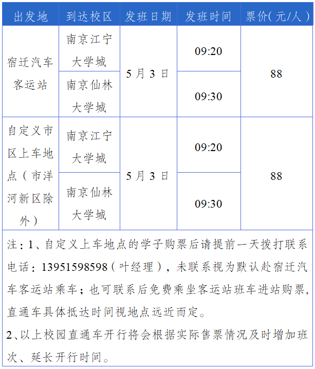 2.購(gòu)票后可自行前往宿遷汽車客運(yùn)站,想要自定義市區(qū)范圍內(nèi)乘車地點(diǎn)(市洋河新區(qū)不在范圍內(nèi))的同學(xué),網(wǎng)上購(gòu)票后請(qǐng)?zhí)崆耙惶鞊艽?3951598598聯(lián)系自定義乘坐地點(diǎn),車輛免費(fèi)上門接送;如未購(gòu)票也可提前聯(lián)系,客運(yùn)站派車接至站內(nèi)購(gòu)票后乘車直達(dá)校園。