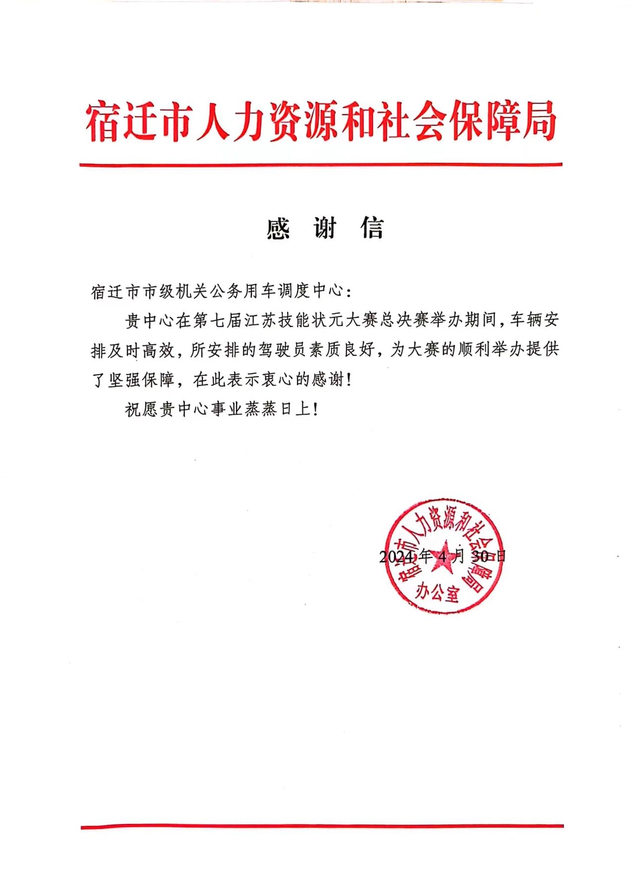 4月30日,宿遷市人力資源和社會(huì)保障局將一封感謝信送至恒通租賃(公車(chē)調(diào)度中心),對(duì)恒通租賃(公車(chē)調(diào)度中心)在本次活動(dòng)保障過(guò)程中安全、高效的服務(wù)品質(zhì)和專(zhuān)業(yè)、用心的工作態(tài)度表示感謝。