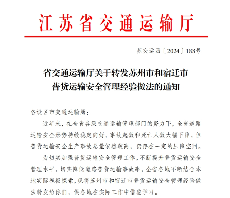 為切實加強普貨運輸安全管理工作,不斷提升普貨運輸安全管理水平,切實降低道路普貨運輸事故率,近日,省交通運輸廳將通湖物流園普貨運輸安全管理經(jīng)驗做法在全省范圍內(nèi)發(fā)文推廣,供各地在實際工作中借鑒學習。