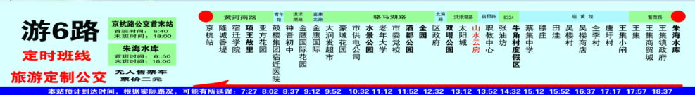 游6路始發(fā)點(diǎn)為京杭路公交調(diào)度站,終點(diǎn)站在宿城區(qū)王集鎮(zhèn)朱海水庫(kù)度假區(qū),全程約32公里,共設(shè)置了35個(gè)站點(diǎn),單程票價(jià)為2元,可享受城市公交刷卡等優(yōu)惠政策。運(yùn)行時(shí)間為早上6:40至晚上18:00,線(xiàn)路采取定點(diǎn)發(fā)班,班次間隔約為50分鐘,后續(xù)將視客流情況調(diào)整運(yùn)營(yíng)班次及發(fā)車(chē)間隔。